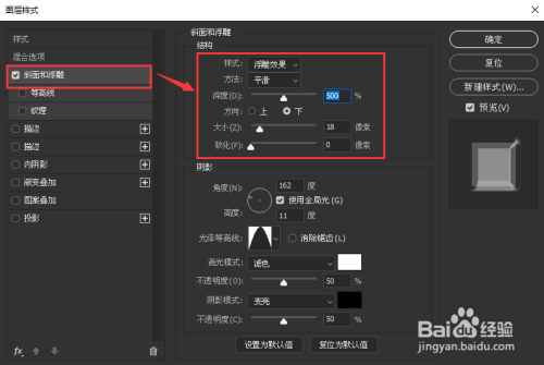 接下来,我们在斜面和浮雕里面,把深度设置为【500】%,方向设置为