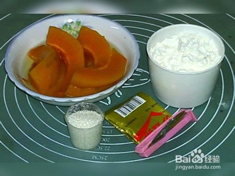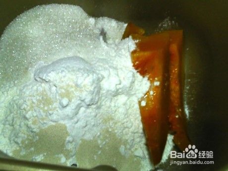 将南瓜泥,面粉,酵母倒入面包机。