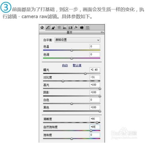 3、前面都是为了打基础,到这一步,画面会发生质一样的变化,执行:滤镜 > Camera raw滤镜,具体参数如下。