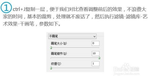1、打开素材图片,按Ctrl + J 复制一层,便于我们对比查看调整前后的效果,不浪费大家的时间,基本的裁剪,处理就不废话了,然后执行:滤镜 > 滤镜库 > 艺术效果 > 干笔画,参数如下。