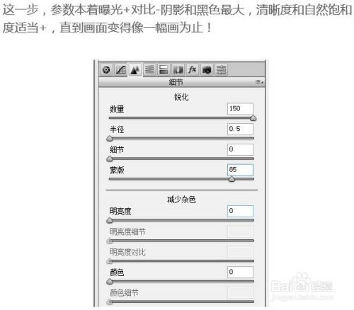 这一步,参数本着曝光 + 对比 - 阴影和黑色最大,清晰度和自然饱和度适当+,直到画面变得像一幅画为止。
