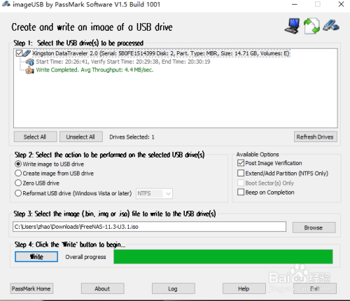 这个时候我们可以利用imageUSB这个软件对镜像文件进行写入。这个写盘软件很小,非常方便,大家可以自行下载。我们将事先准备好的U盘插入到电脑上,这样打开imageUSB这应用程序。我们按照提示在step1,勾选我们的U盘;step2,默认就是写入到USB驱动;step3就是点击加载我们下载好的ISO镜像,然后点击step4的write安检。