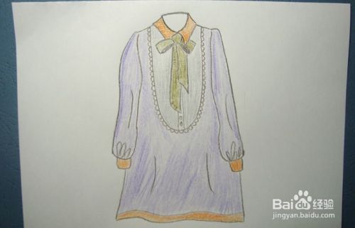 最后,用紫色彩铅笔给连衣裙的整体图形涂上颜色,并用橙色彩铅给裙摆图形涂上颜色,注意颜色要搭配好看,这样漂亮的连衣裙彩铅画就画好了,如下图所示。