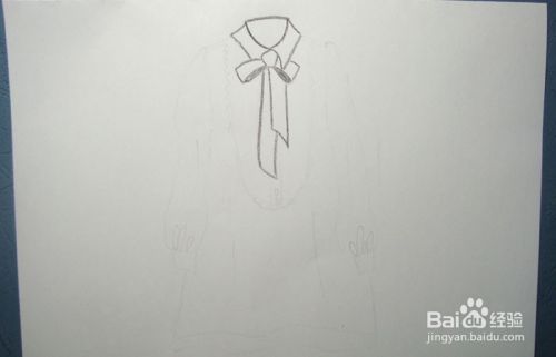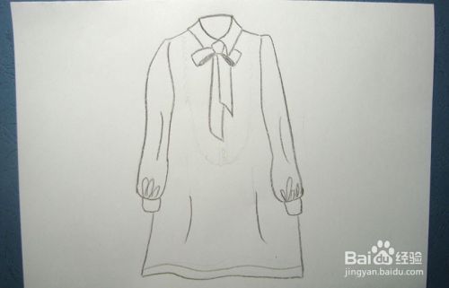 用铅笔在白纸上,画出漂亮的连衣裙的草图,接着用黑色彩铅笔绘画出连衣裙的衣领和领带图形部分,如下图所示。