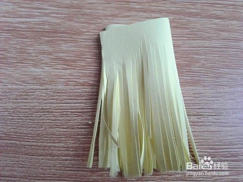 将黄色的卡纸对折裁开。将其中的二分之一对折,再对折,用剪刀将黄色卡纸的三分之一剪成细长条。