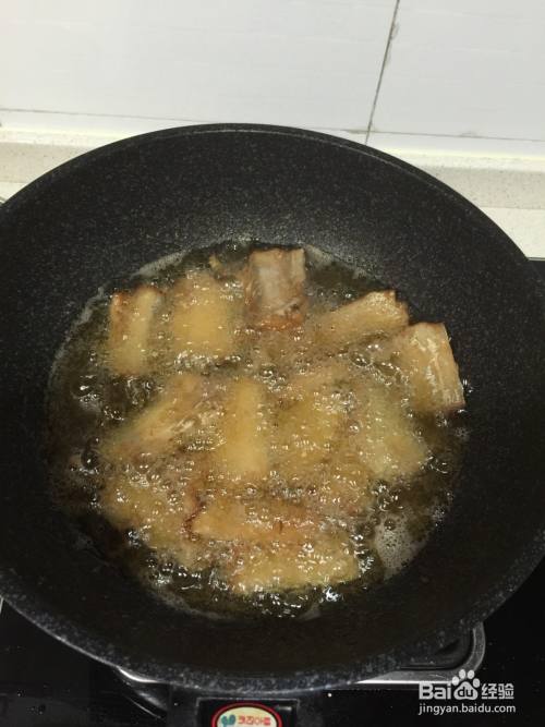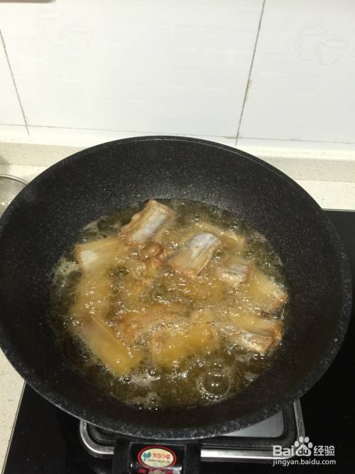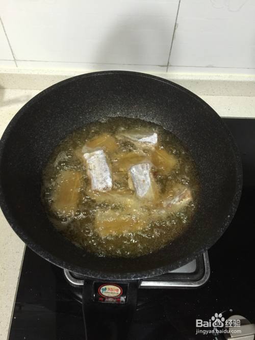 锅里烧油,油温六成热时下裹了面粉的带鱼下去炸,先大火让带鱼定型。