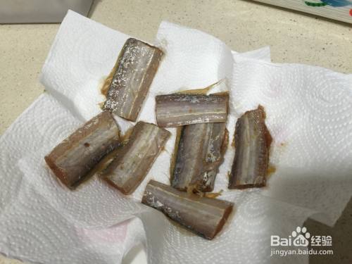 腌好的带鱼取出来,放吸油纸上面吸干水份。