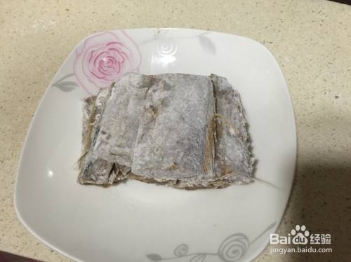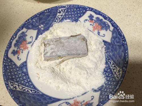 盘子里倒些面粉,将带鱼逐一裹上面粉。
