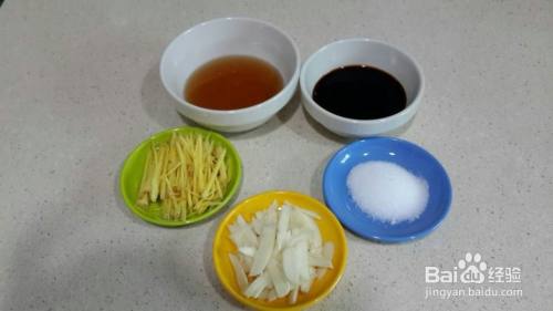 准备带鱼的腌料:料酒、蒜片、姜丝、生抽、盐和糖。