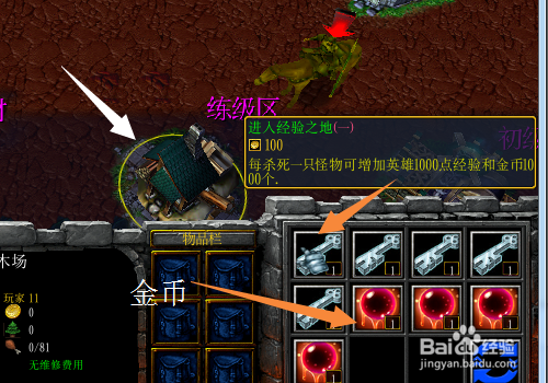 之后,去购买一个技能,完事来到练级区,进入经验房,升级、打金币。
