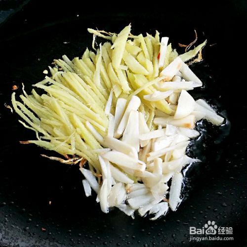 将姜蒜丝炒匀,然后倒入鱼干,炒匀,加入料酒,用酱油炒匀。