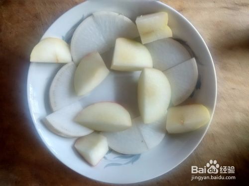 在这盘拼盘里我放入了白萝卜,毛桃和苹果。因为它们都是白色的,因此,我就起了白雪皑皑蔬果拼盘,这个名字。来,和我学做吧!