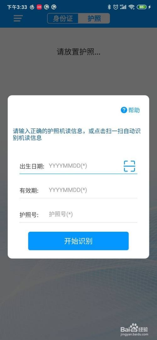 输入正确的护照机读信息,(如不清楚怎样手动填写,可点击右上方“帮助”)或点击扫一扫自动识别。