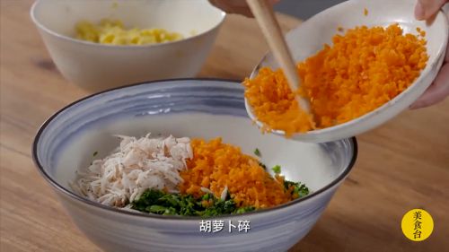 4在碗里加入虾皮,胡萝卜碎,鸡蛋碎,耗油,搅拌,加盐,芝麻油,葱花,拌匀。