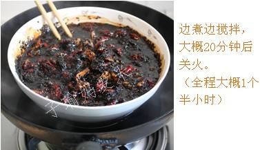 4待冰糖全部融化后,加入核桃肉和桂圆肉,搅拌均匀,看到均匀裹上阿胶液之后,加入红枣肉搅拌均匀,再加入黑芝麻搅拌均匀。边煮边搅拌,大概20分钟后关火。(全程大概1个半小时)