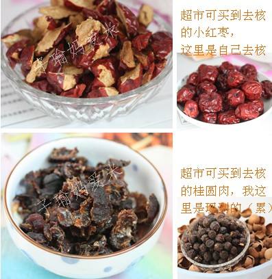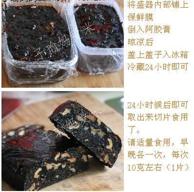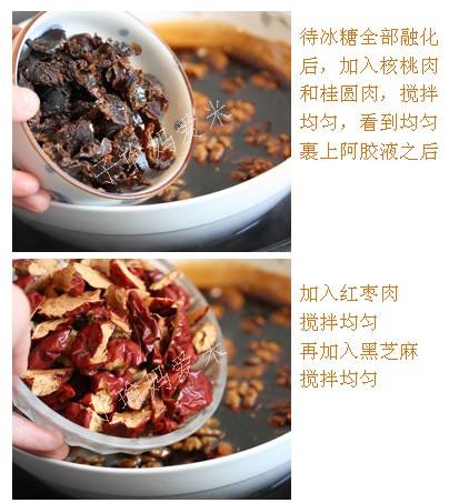 材料:阿胶250克(半斤),熟的黑芝麻200克,熟的核桃仁200克,桂圆肉150克,红枣肉150克,冰糖250克。