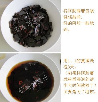 1将阿胶隔着包装轻轻敲碎。好的阿胶一敲就碎。用1:1的黄酒浸泡3天。(如果将阿胶磨成粉再浸泡的话半天时间就够了)主要是为了泡软。