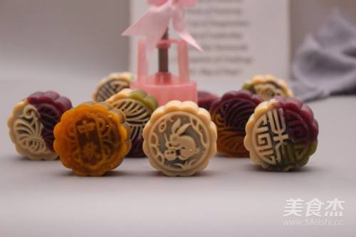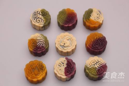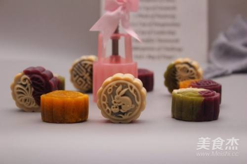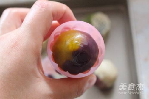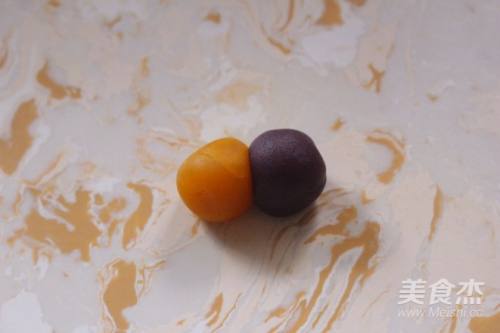 2将豆沙分成30g每个,桃山皮用了多种材料的,分成每个为20克(如果由多种颜色,则平均分开克数),颜色根据自己的喜好选择