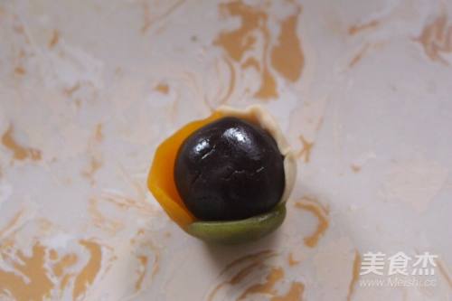 5然后将豆沙包进去,用手的虎口位置慢慢捏紧