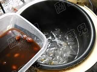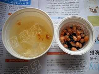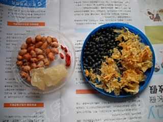 7煮好的黑豆、花生连汁一起倒入银耳中。