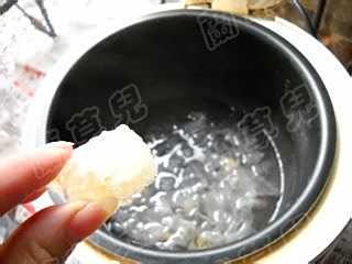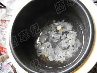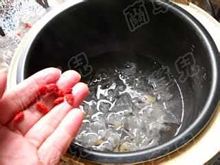 4银耳洗净,倒入电饭煲,加入冷水,煮饭档炖煮30分钟。