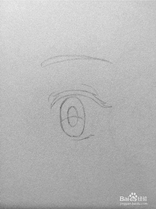 在椭圆的中间再画一个小的椭圆介绍我们的瞳孔,在椭圆中间画一条弧线就是眼睛的明暗分界线。