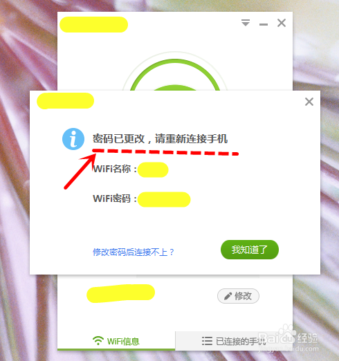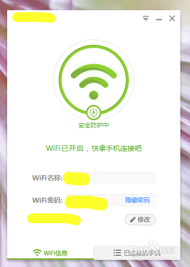 在打开的WiFi页面中,我们可以看到原先的WiFi名称和密码以及已连接的手机信息;