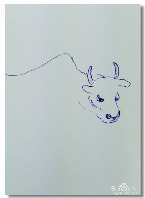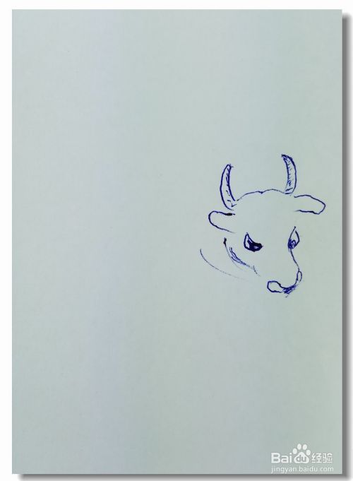 在白纸上画出牛的头部轮廓,并画出牛的眼睛,鼻子,嘴巴,然后再用曲线画出牛的耳朵和牛角。