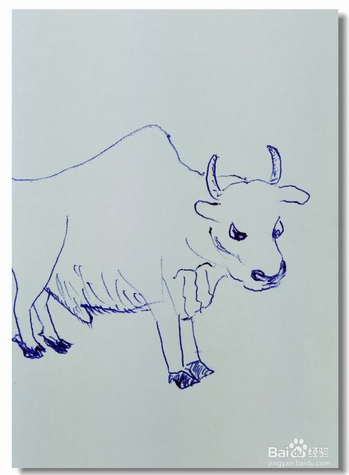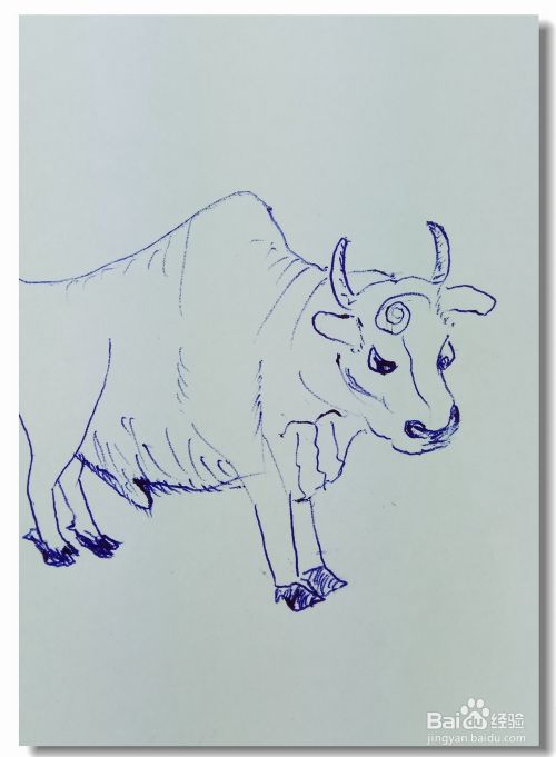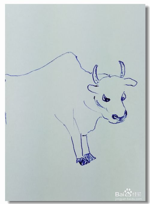 再用线条画出牛的腹部,用曲线和线条画出牛的后腿部分。