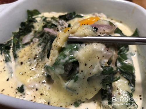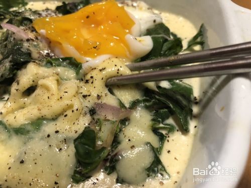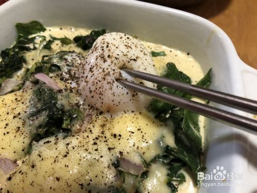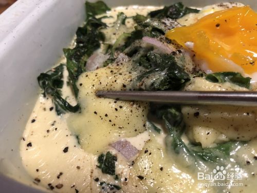 5.上面放上温泉蛋?? 奶酪??撒上黑胡椒,放入烤箱,230℃,10-15min就行啦。注意观察,奶酪烤的黄黄的最好,我有点嘴急,着急吃,烤了一会??