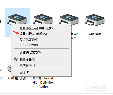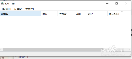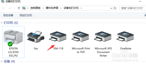在设备和打印机窗口,可以清楚的看到KM-118是我们正在使用的打印机型号,鼠标右击此打印机型号图标,在弹出的菜单里,选择“设置为默认打印机”。