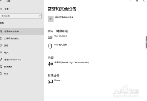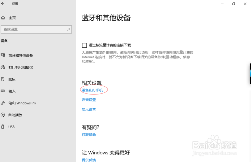 点击设置窗口界面左侧栏目里的“蓝牙和其他设备”,向下拖拉窗口右侧的滚动条,这时可以看到“设备和打印机”选项。点击进入。
