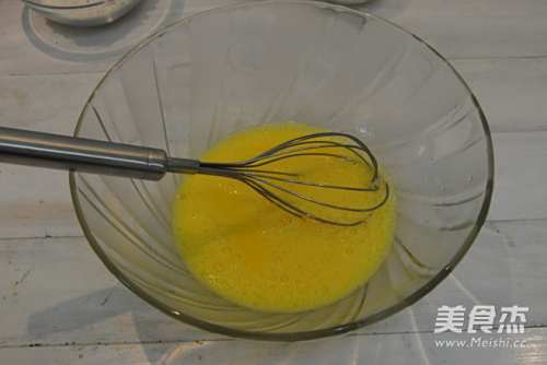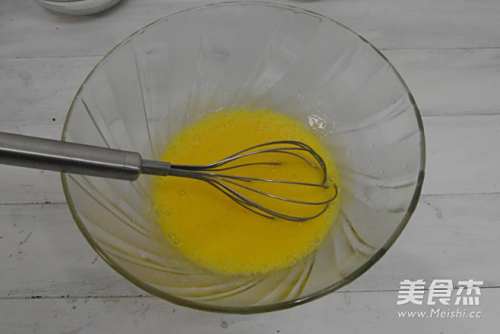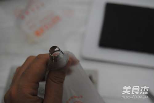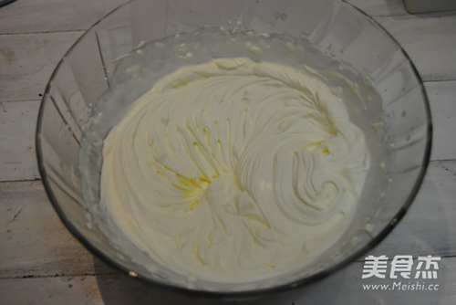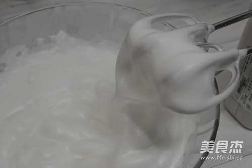 7细砂糖分三次加入蛋白内打发至湿性发泡,即出现大弯勾即可