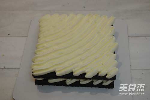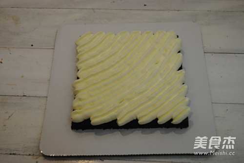 17蛋糕托上放上一块蛋糕片,斜角挤上奶油