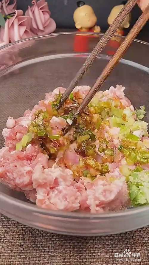 肉馅中放入葱姜蒜生抽蚝油盐鸡精等搅匀