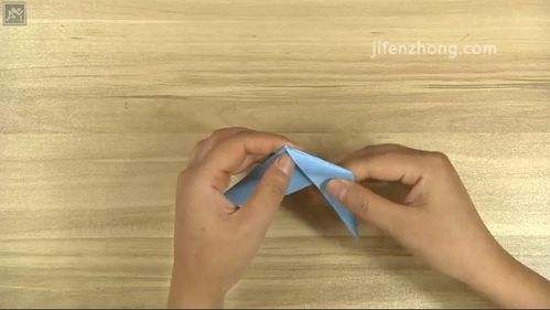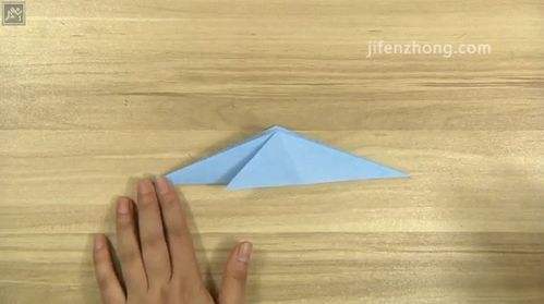 14将尖角的上部沿“兔子耳朵”的上沿折下,再展开。