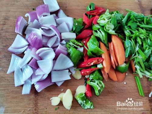 洋葱、青红椒、胡萝卜和芹菜洗好切好,再切几片姜;