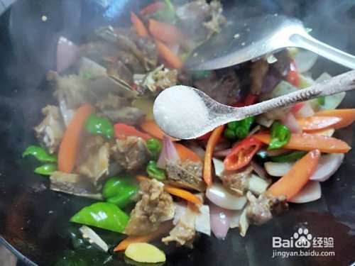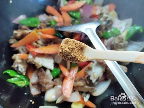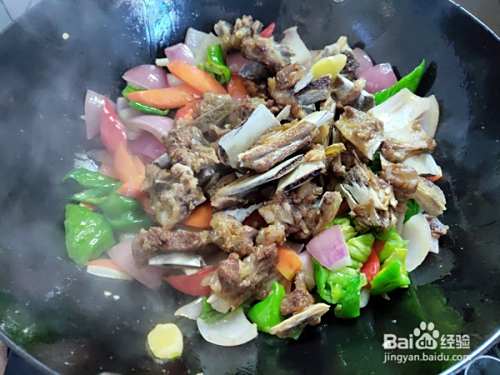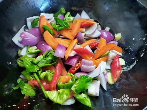 锅内留一点底油,下姜片,将洋葱、青红椒和胡萝卜炒至断生;