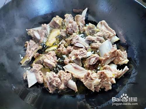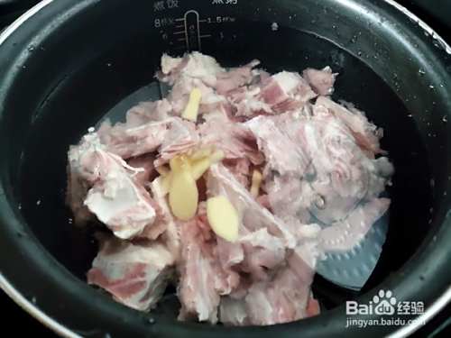 将洗干净的羊排放入锅中,放几片姜,先煮熟。如果是嫩羊排,就用电饭锅煮,成年羊排就用高压锅煮,不然后面嚼不动;