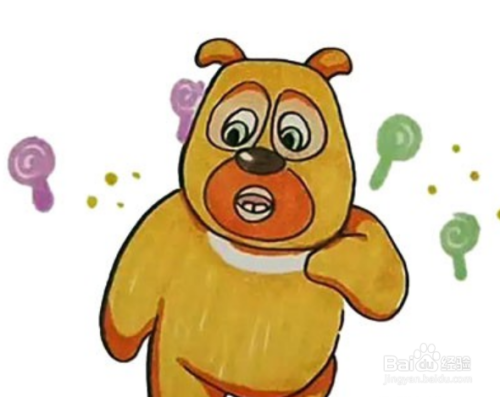 第五步用水彩笔为简笔画熊二涂上色彩。