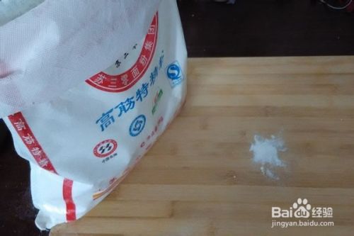 在面板上,放入适当的碱面跟薄面,然后将饧好的成面团放到面板上,揉匀。