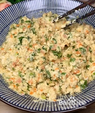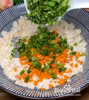 首先将豆腐捣碎,加入火腿丁、胡萝卜丁、葱花、香菜、盐、鸡精和花椒粉