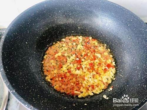 起炒锅烧热色拉油和泡椒油,放入剁好的碎末炒出香味。