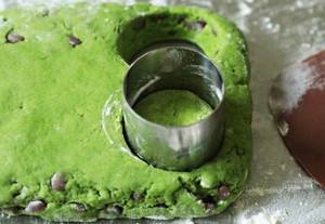 把面团擀成厚约2cm的面饼,用直径5cm的切模切出面团,切之前可以在模子内壁抹一下面粉,切的时候就可以防粘。