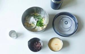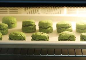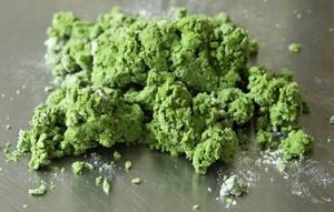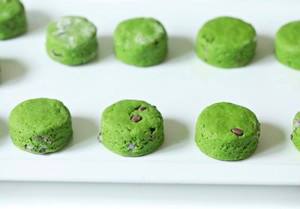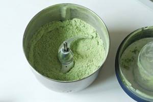 把切成小块的黄油、面粉、抹茶粉、泡打粉、海盐、砂糖,一起放入搅拌机中,盖好盖子,开机打10秒,就可以看到面粉和黄油已经混合成粗粒状。