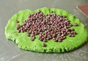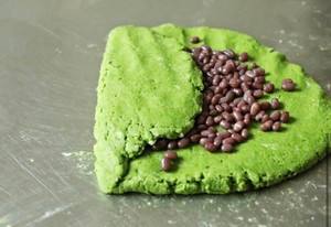 用手团在一起再压扁铺上蜜红豆右折叠起来