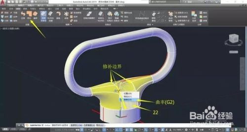 执行“曲面修补”命令,选择修补边界,生成中间的曲面22,并设置表面连接形式为“曲率(G2)”。↓