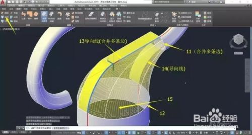 执行“曲面放样”命令,选择截面11、12进行放样,并设置曲面边13、14为导向线。【注意:截面11、导向线13得用合并多边的方式进行选择】↓