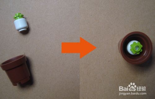 接着,搭建绿萝植物模型的花盆图形,由一个花盆积木和一些零件积木所组成。左边是拼装所需的零件,右边是拼装好后的整体结构效果,如下图所示。