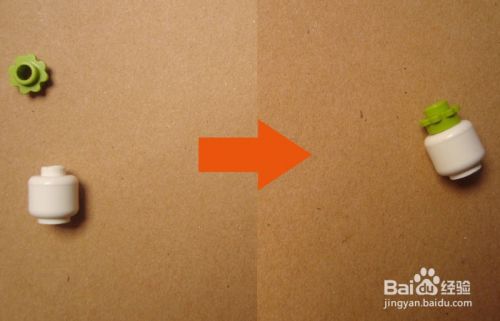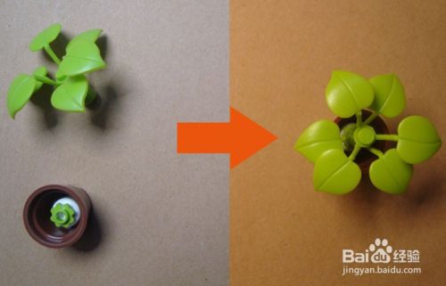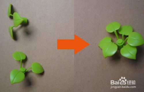 然后,绿萝植物模型的叶子图形,由两个叶子形积木所组成。左边是拼装所需的零件,右边是拼装好后的整体结构效果,如下图所示。